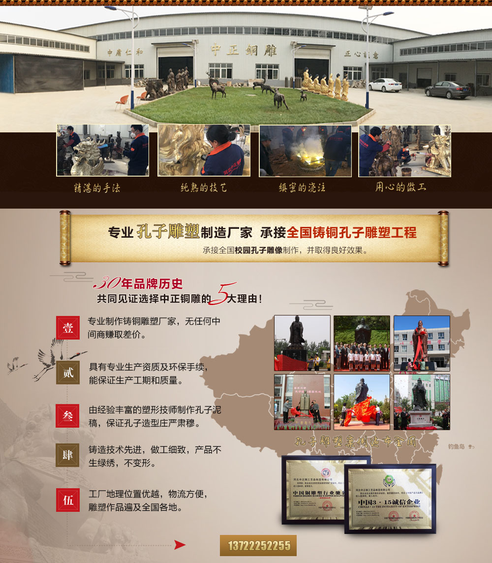 我廠是河北專業制作鑄銅孔子雕塑廠家,是具有自主設計圖紙、雕刻泥稿、鑄造銅雕、安裝施工能力的單位。對加工鑄銅孔子雕塑有著豐富的經驗,能很好的把握孔子雕塑的形態,使其造型端莊、大方而又不失儒雅、慈祥。我們擁有完善的生產設備,環保達標,手續齊全。廠內有多位技術熟練的鑄造技師指導生產制作。在生產傳統造型的孔子雕塑之外,也可按客戶提供孔子造型訂做不同姿態的銅雕塑,材質也可以選擇不同銅質如:青銅、紫銅、黃銅等。
